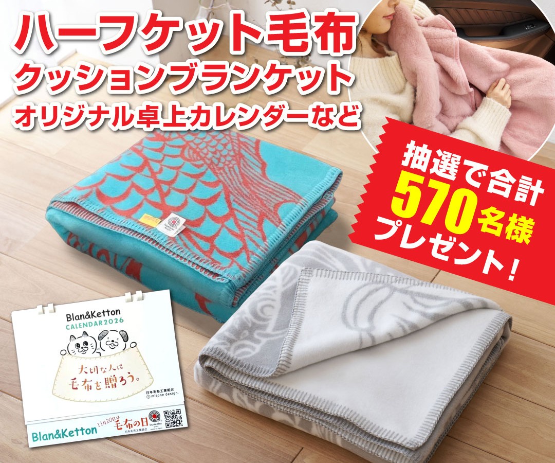 「ハーフケット毛布」「クッションブランケット」など、抽選で570名様にプレゼント!! ただいま日本毛布工業組合では「Qマーク普及キャンペーン」としてプレゼント企画を開催中です。 ・ハーフケット(アートブランケットシリーズ) 10名様 ・クッションブランケット 60名様 ・毛布工業組合公式キャラクター「ブラン...